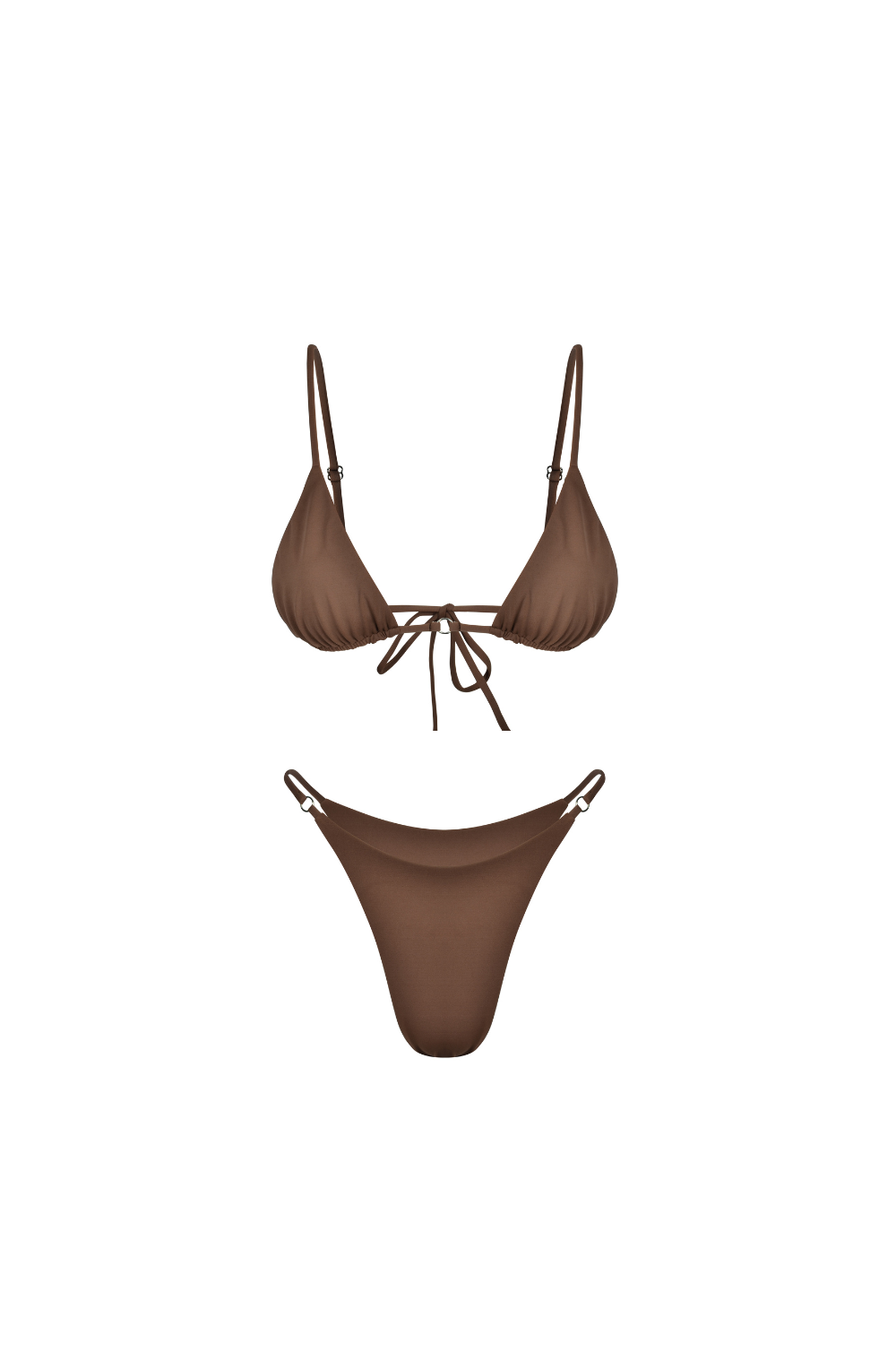 The Luna Triangle Set by Dearloe Swim is basic but classic looks. The set is perfect for a minimal tan with cheeky coverage bottoms. They are made from recycled fiber from plastic bottles (Repreve Polyester). This set comes with a canvas bag.